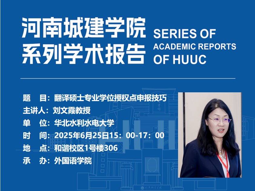 全校广大师生:华北水利水电大学刘文霞教授应邀为我校师生作学术报告,现将有关事项通知如下:一、报告题目翻译硕士专业学位授权点申报技巧二、报告时间和地点时间:2025年6月25日下午15:00-17:00地点:和谐校区1#306室欢迎广大师生...