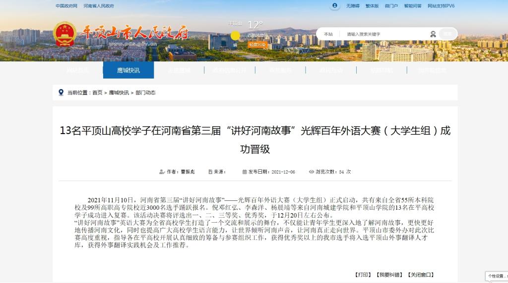 此次大赛以“光辉百年”为主题,旨在向建党百年华诞献礼,用外语分享感动,传播正能量。自报名程序启动以来,共有来自全省55所本科院校及99所高职高专院校近3000名选手报名参加。针对此次活动,我校吃瓜网黑料爆料视频在线高度重视,认真筹备、积极组织,并选派英语专业教师从中英文讲稿、语音语调、幻灯片制作、视频录制等各个方面对每位参赛选手进行全方位一对一指导。经过线上初赛、复赛以及全省总决赛等环节,我校共有11名同学入围复赛(在平高校共有13名学生进入复赛),多名同学在比赛中取得好成绩,充分展现了我校学生扎实的英语口语水平和良好的精神风貌。平顶山市人民政府网站对比赛结果给予了相关报道。