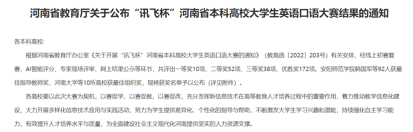 (通讯员 张湘雨)7月26日,河南省教育厅官方网站发布了《河南省教育厅关于公布“讯飞杯”河南省本科高校大学生英语口语大赛结果的通知》,我校吃瓜网黑料爆料视频在线学生程元素、董月鑫喜获二等奖,池钰倩、陈意婷与土木与交通学院学生黄俊飞获优胜奖,景丽亚和张湘雨获最佳指导教师奖。