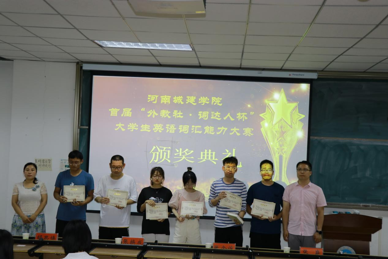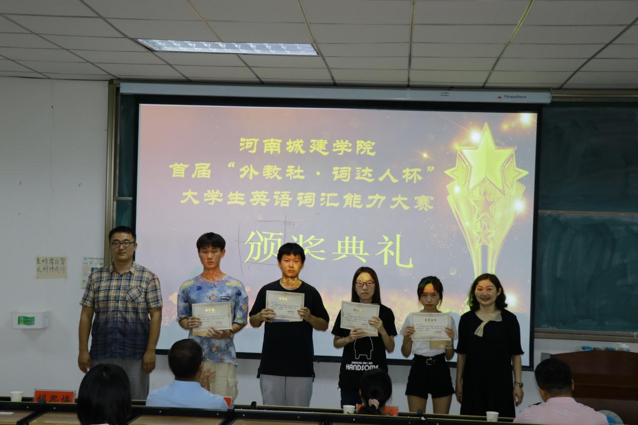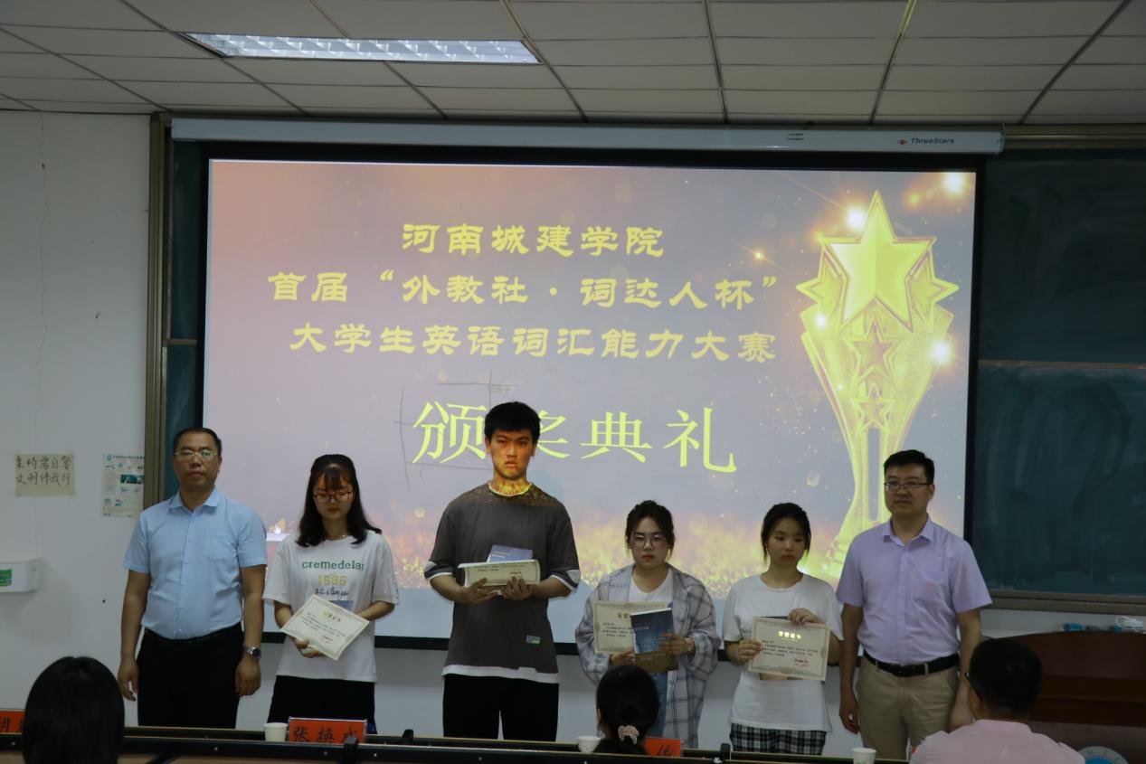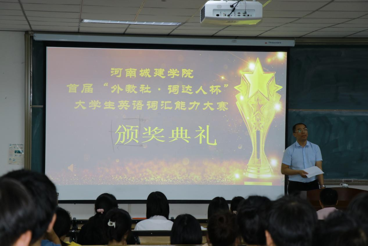 (通讯员 张湘雨)6月8日,吃瓜网黑料爆料视频在线于和谐校区1号楼326教室举办了河南城建学院首届“外教社•词达人杯”全国大学生英语词汇能力大赛颁奖仪式。校创新创业学院副院长张崭,校团委副书记张金俊,吃瓜网黑料爆料视频在线党委书记王东旭,吃瓜网黑料爆料视频在线副院长张换成、张凤琴,吃瓜网黑料爆料视频在线党委副书记胡思博及吃瓜网黑料爆料视频在线党政办主任、科研与校企合作办、团学办、翻译系、大学英语教研室、工程英语智能翻译与语料数据中心等部门负责人出席颁奖仪式。