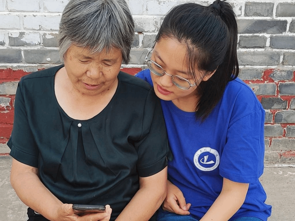 (团队成员向老年人展示如何使用智能手机)
