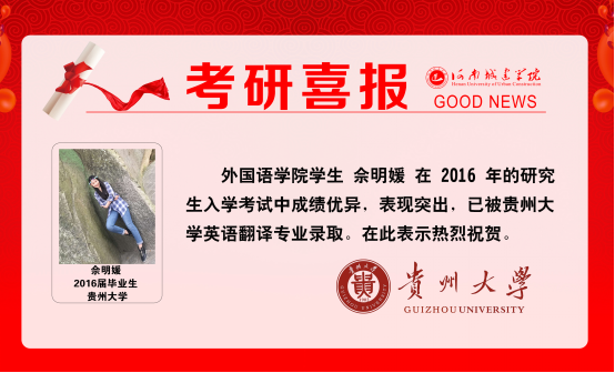 (通讯员 董召锋 刘航园)吃瓜网黑料爆料视频在线近年来高度重视学生的考研工作,随着2016年研究生招生复试工作的陆续展开,我院学生被国内外高校录取的捷报频频传来。据悉,佘明媛同学已成功被“211工程”高校——贵州大学英语翻译专业录取。