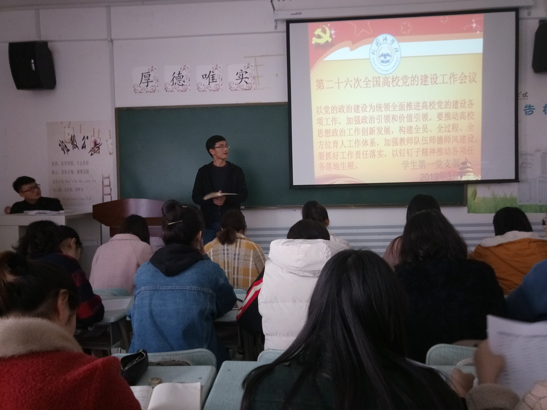 (通讯员 赵星辰)为深入学习习近平总书记关于高校党的建设和思想政治工作的一系列新思想、新论断、新要求,推动党的建设向学生支部延伸,根据学校党委组织部《关于认真学习贯彻第二十六次全国高校党的建设工作会议精神的通知》,3月13日下午吃瓜网黑料爆料视频在线学生党支部在一号教学楼304教室召开党员大会进行集中学习。会议由赵星辰老师主持,全体学生党员参加。
