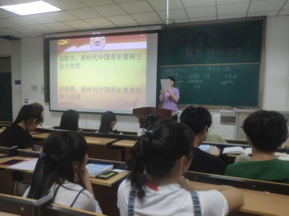 大一心理委员作为演讲者,演讲的主题分别是:杨勤杰:新时代中国青年要树立远大理想;冯微微:新时代中国青年要热爱伟大祖国;韩子奥:新时代中国青年要担当时代责任;王佳鑫:新时代中国青年要勇于砥砺奋斗。树立为人民服务的远大理想,怀抱热爱伟大祖国的满腔热情,勇于担当时代赋予的责任,敢于为国家和民族砥砺奋斗,有助于新时代青年克服心理健康危机,加强心理健康的自我教育。