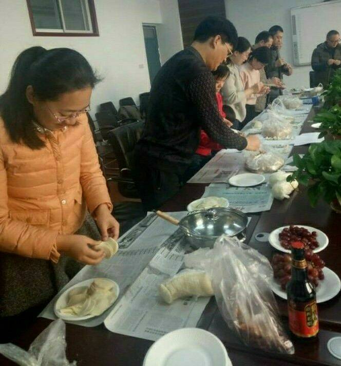 上午11点,老师们就纷纷来到学院会议室开始包起饺子。大家分工有序、忙而不乱,一边忙碌一边相互对饺子形状点评。不一会儿,热腾腾的饺子出锅了,幸福的笑容展现在每个教工脸上。虽然室外寒气袭人,但会议室内欢声笑语、温暖四溢。