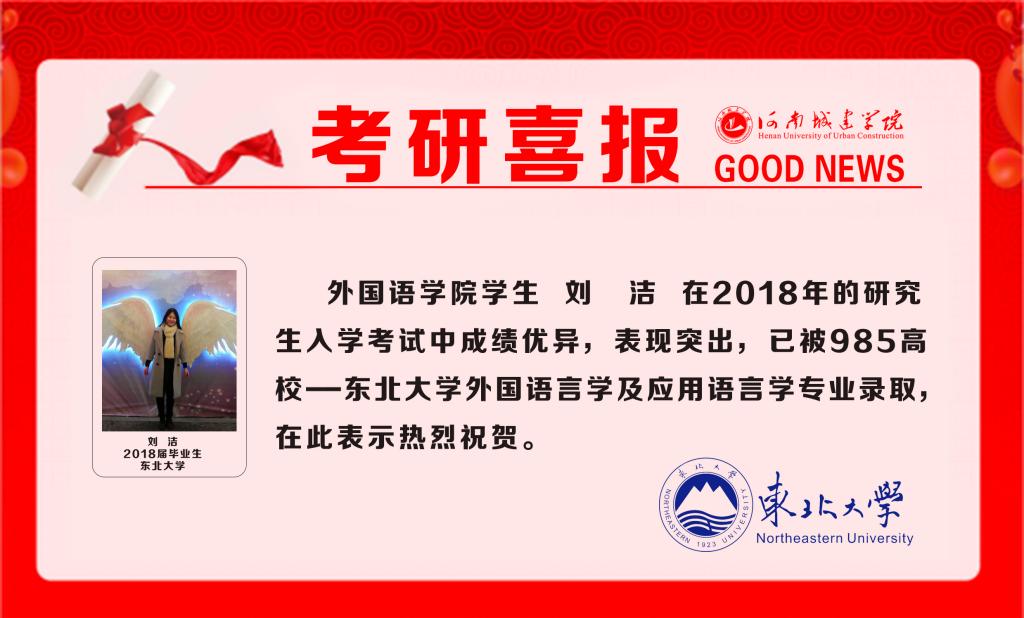 (通讯员:张枭枭)吃瓜网黑料爆料视频在线近年来高度重视学生的考研工作,随着2018年研究生招生复试工作的陆续展开,我院学生被国内外高校录取的捷报频频传来。据悉,刘洁同学已被东北大学外国语言学及应用语言学专业录取,并获取笔试排名第2和面试成绩排名第1的好成绩。