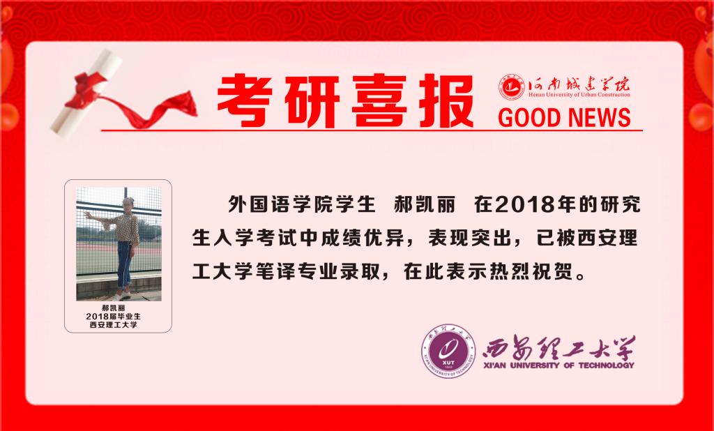 2018年研究生招生复试工作的陆续展开,我院学生被国内外高校录取的捷报频频传来。据悉,赫凯丽同学已成功被西安理工大学笔译专业录取。