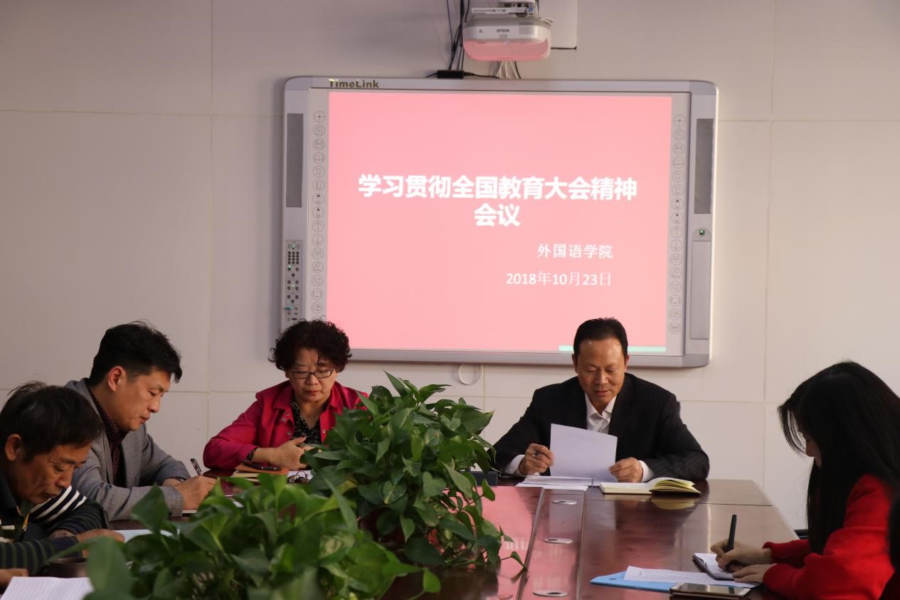 会上,秦平新院长首先传达了学校《关于进一步学习贯彻全国教育大会精神和新时代全国高等学校本科教育工作会议精神的通知》,强调了学习此次会议精神对于提升本科教育教学质量水平以及培养新时代高素质大学本科人才的重要意义。接着,秦平新院长带领全体教职员工再次学习了“习近平总书记9月10日在全国教育大会上的讲话”及“教育部陈宝生部长在新时代全国高等学校本科教育工作会议上的讲话”精神。他指出,高校教师必须反复学、认真学,深刻领会会议精神,将之切实落实到每位教师的课堂当中去。最后,他要求全体教师紧跟时代步伐,充分利用现代教育技术和互联网,结合当代学生的学习特点进行教学模式的探讨和改革,以适应学生的学习需求,为我校本科教育质量的提升做出努力。