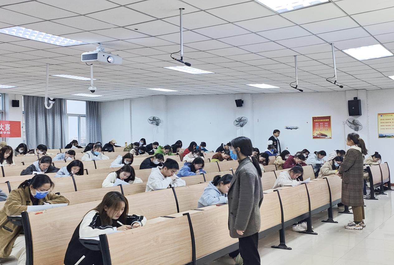 竞赛内容以标准版英文党的二十大报告为主,另包括习近平新时代中国特色社会主义思想、习近平总书记系列重要讲话及《中国共产党章程》等内容。竞赛以笔试形式进行,题型新奇有趣,要求参赛选手学习和掌握标准内容,充分贯彻“以赛促学”的理念。比赛过程中选手们热情投入,竭尽全力,认真答题。现场气氛紧张而有序,选手们沉着冷静应对考试,力争获得最佳的成绩。参赛选手们准确运用翻译科学理论,积极发挥译者作用,力求准确生动的翻译表达,用英语讲好中国故事。