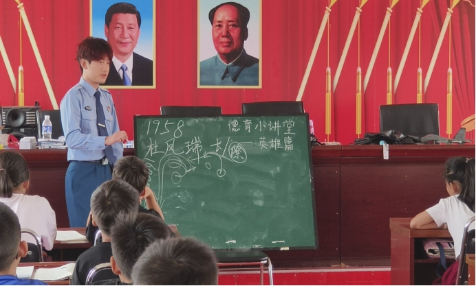 本次支教活动围绕德育、智育、体育、美育和劳动实践开展。其中德育小讲堂主讲人由支教团成员2022级学生周浩宇担任,该生曾服役于东部战区94833部队。在课堂上,他以自身服役经历为鲜活教材向小朋友们展示部队生活,并生动地讲解英雄人物杜凤瑞事迹,引导小朋友们向英雄致敬,自觉传承红色基因。