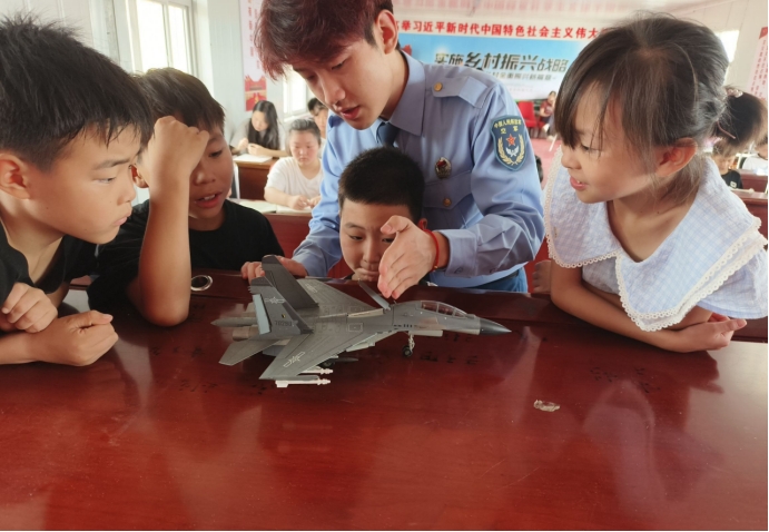 (实践团成员向同学们展示飞机模型)