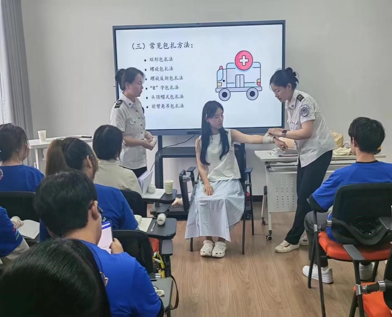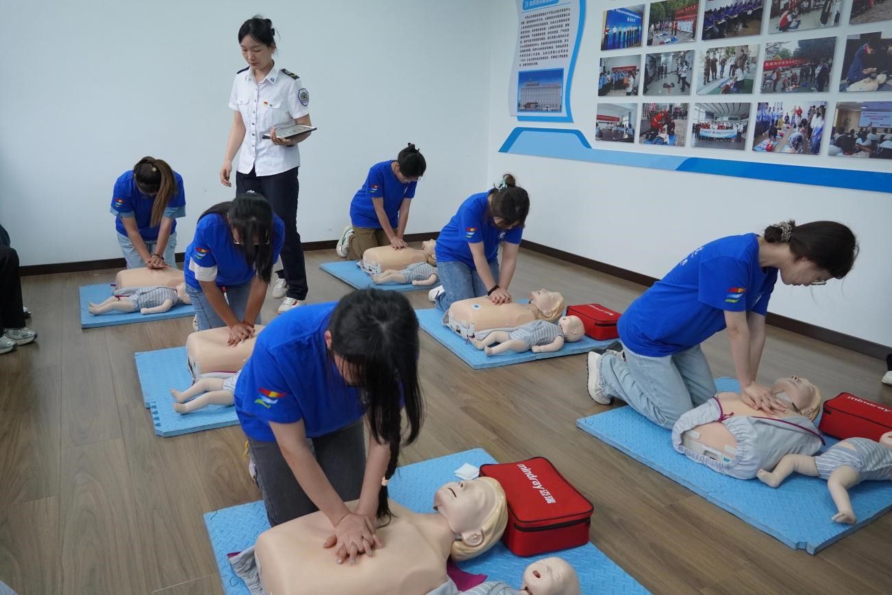 活动以“普及急救知识,守护生命安全”为主题,医疗应急中心葛老师详细讲解了心肺复苏术、气道异物梗阻急救法、自动体外除颤仪(AED)的使用和创伤等应急救护知识,组织学生亲自动手操作AED,用模拟人进行心肺复苏等技能实操演练。理论和实操环节结束后,团队参观了120调度中心,近距离观看了120平台的实时运行状况,学习了拨打120电话时的注意事项。