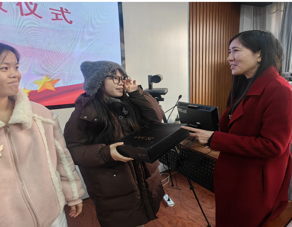 为切实把党和国家以及学校对家庭经济困难学生的关怀落实落细,确保同学们能够安心在校学习和生活,温暖过冬。12月5日吃瓜网黑料爆料视频在线在美荟楼306会议室开展2024年爱心保暖衣发放仪式。吃瓜网黑料爆料视频在线党委书记王宏、党委副书记兼副院长代博君、辅导员阎玉茹以及5名受资助学生代表参加本次活动。