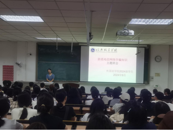 为加强安全教育,引导学生牢固树立防诈骗意识,提高自身防诈能力,9月8日上午,我院在美荟楼328教室组织2024级新生辅导员及2024级新生共100余人,开展了防范电信网络诈骗主题班会。