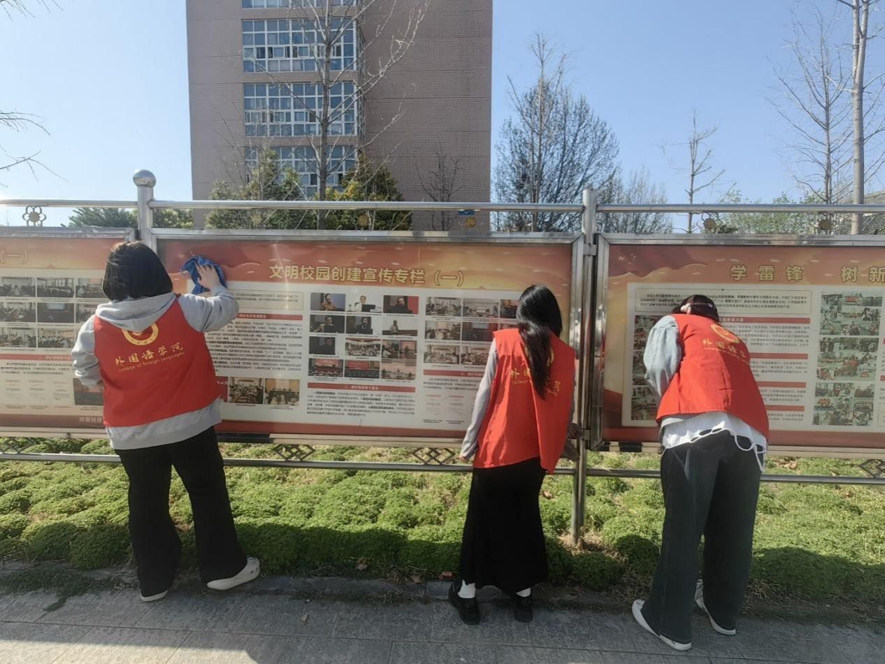 活动期间,志愿者们分工明确,热情高涨。他们认真清扫落叶、纸屑、烟头以及饮料瓶等垃圾,不放过任何一个卫生死角。同时擦拭校园宣传栏及栏杆,使校园面貌焕然一新。