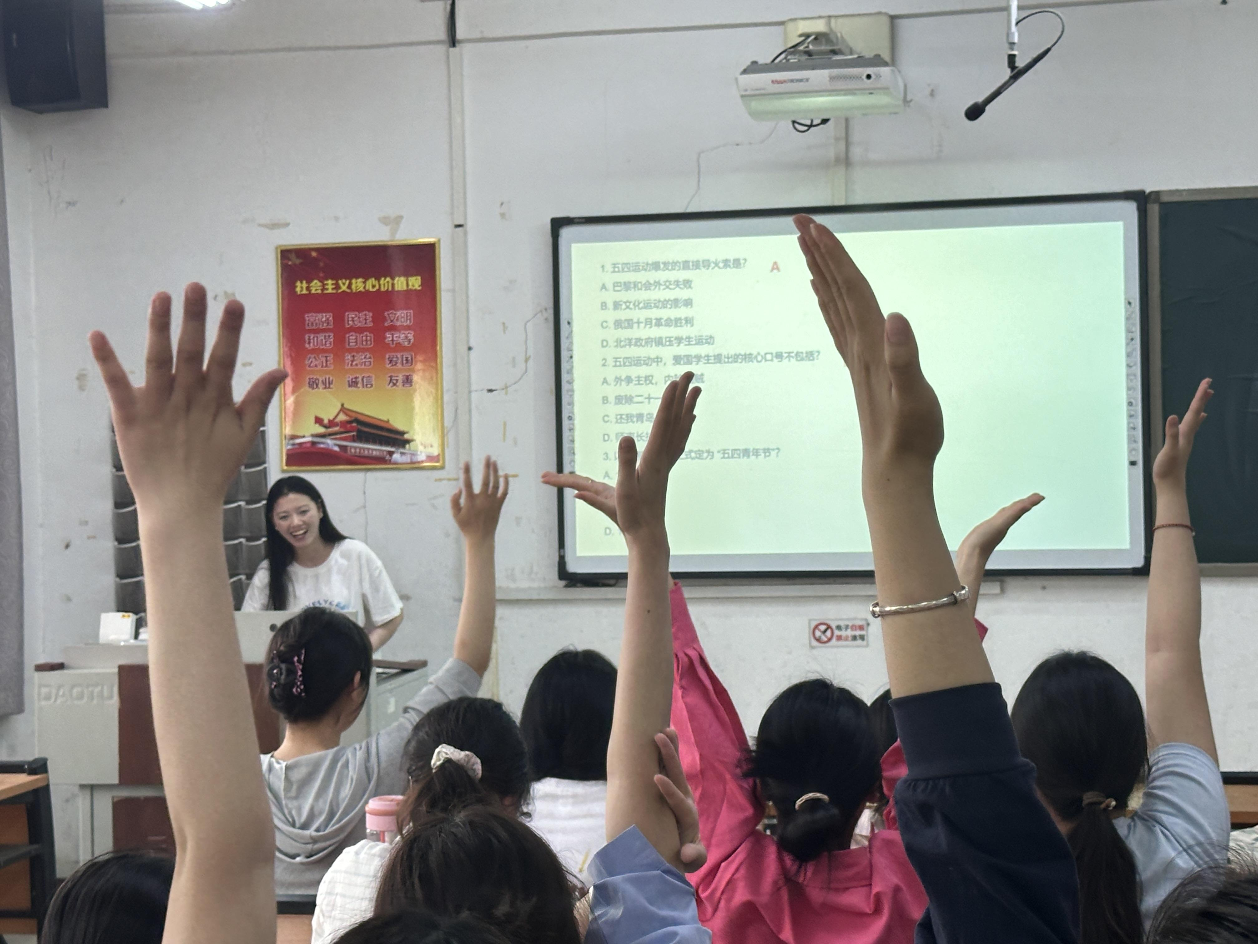 活动在激昂的开场白中拉开帷幕,主持人深入阐述了五四运动的历史意义与当代青年的责任担当。随后,全体同学共同观看了电影《1921》,通过影片感受百年前热血青年为国家前途命运奔走呼号的峥嵘岁月。观影后,同学们踊跃上台分享感悟,讲述印象深刻的情节与人物,现场气氛热烈。知识答题环节更是将活动推向高潮,题目涵盖了五四运动历史、党史等内容,每一个同学都积极抢答,现场笑声、掌声不断。游戏环节同样精彩,看图猜历史人物、红色歌曲猜猜猜等游戏,让同学们在欢乐中重温红色历史,传承红色基因。