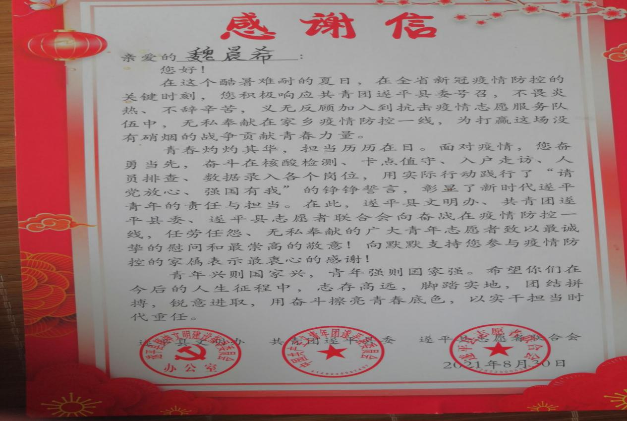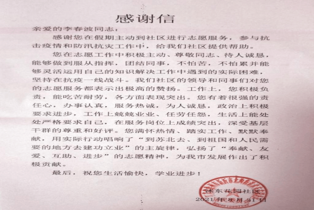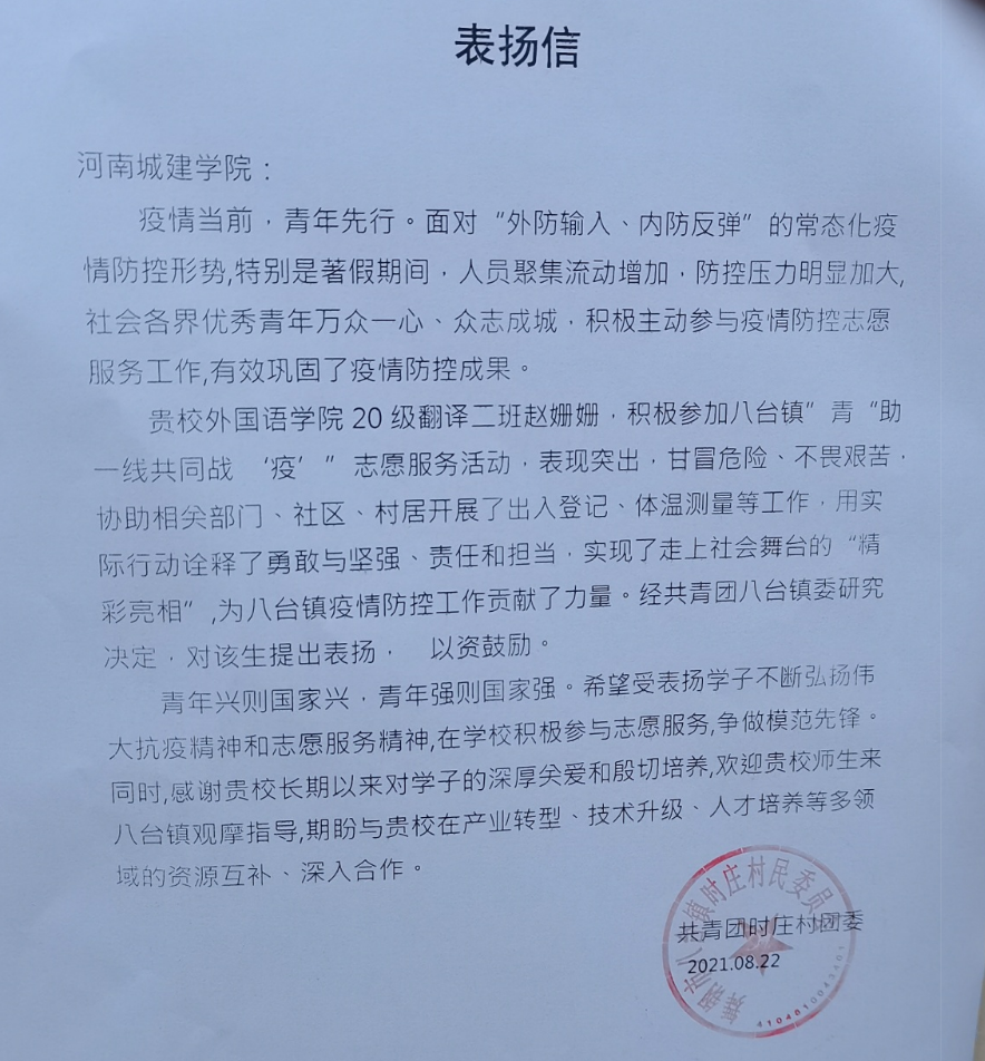 (通讯员 于瑞雪 孙巾奥)这个暑假,对于河南省来说是不平凡的,疫情叠加汛情。我院学子利用暑假,积极参与当地防疫抗洪志愿者服务,为家乡做出自己的贡献,用担当书写了最美芳华。一封封感谢信不仅是对我院教育事业的肯定,更彰显了我院学子无私奉献,勇于担当的优秀品质。