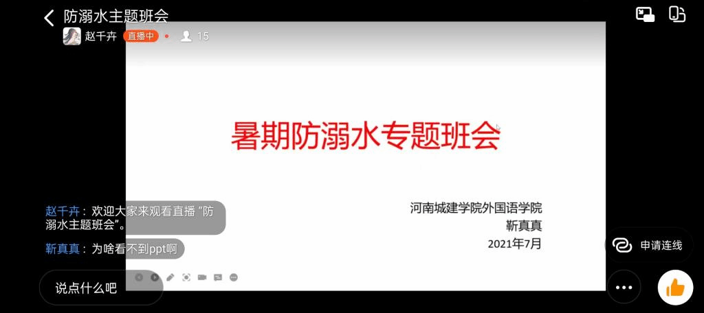 (通讯员 仝晓菲 王雨晴)7月17日以来,河南省出现了罕见的极端降雨天气,造成人员伤亡,城市内涝,农田积涝,山区山洪等严重影响。近日,南京发生疫情后,传播链已蔓延至多省,并呈现快速蔓延趋势。为有效开展汛期安全教育及疫情防控教育,增强学生防范意识和自我救助的能力,吃瓜网黑料爆料视频在线各年级辅导员迅速通过腾讯会议、微信、qq等线上方式召开防汛、防疫、防溺水安全知识教育主题班会,让每位同学都能了解汛期安全常识,提升疫情防控能力,掌握避险、自救、自护、互救能力,增强安全防范意识与技能。