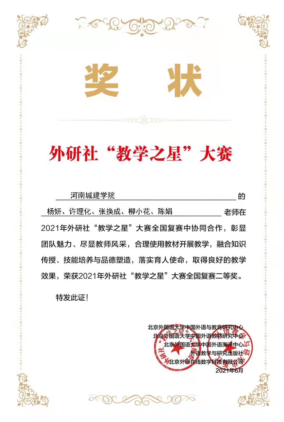 近日,2021年外研社“教学之星”大赛(本科英语组)全国复赛结果揭晓,由我校吃瓜网黑料爆料视频在线杨妍、许理化、张换成、柳小花、陈娟老师组建的《基础英语》课程教学团队喜获英语类专业组团队二等奖。