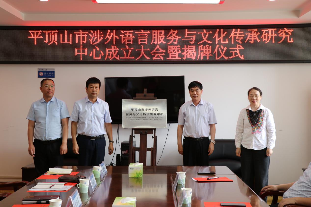 在热烈的掌声中,宿金勇、张富强、马新云、张换成共同为平顶山市涉外语言服务与文化传承研究中心揭牌。
