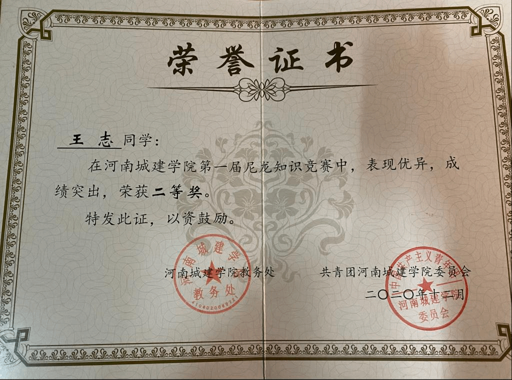 (通讯员 靳真真 韩笑妍)12月12日,由教务处、校团委主办,材料与化工学院承办的“展学子风采,长尼龙知识”第一届尼龙知识竞赛决赛在5号教学楼C座114教室举行,我院2020级英语专业王志同学荣获二等奖。