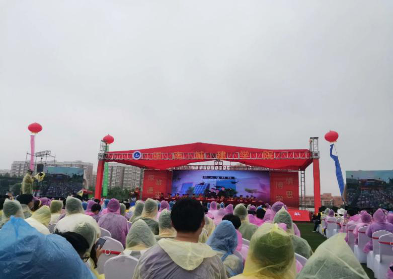 (院党总支副书记张换成冒雨搬运报到桌椅)