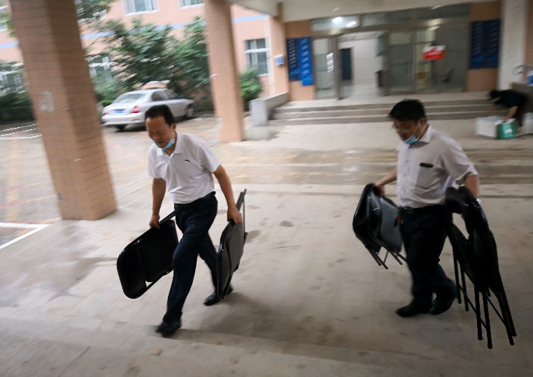 (院长秦平新和副院长秦小锋冒雨搬运报到桌椅)