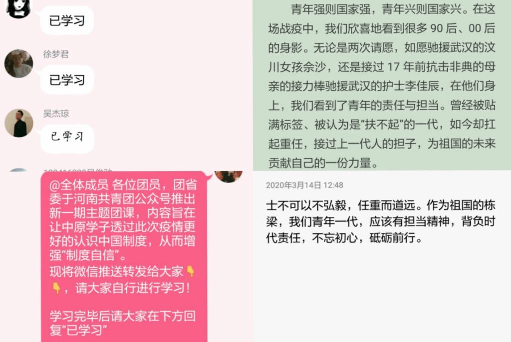 (通讯员 靳真真 朱梦佳)为引导广大青年团员深刻认识此次疫情中所体现出的中国特色社会主义制度的优越性,进而增强“制度自信”。根据校团委安排,3月13日到15日,吃瓜网黑料爆料视频在线团总支组织大一至大四各团支部通过QQ、钉钉、腾讯会议等平台组织开展“全民战‘疫’疫与坚定中国特色社会主义制度自信”主题“云”团课。