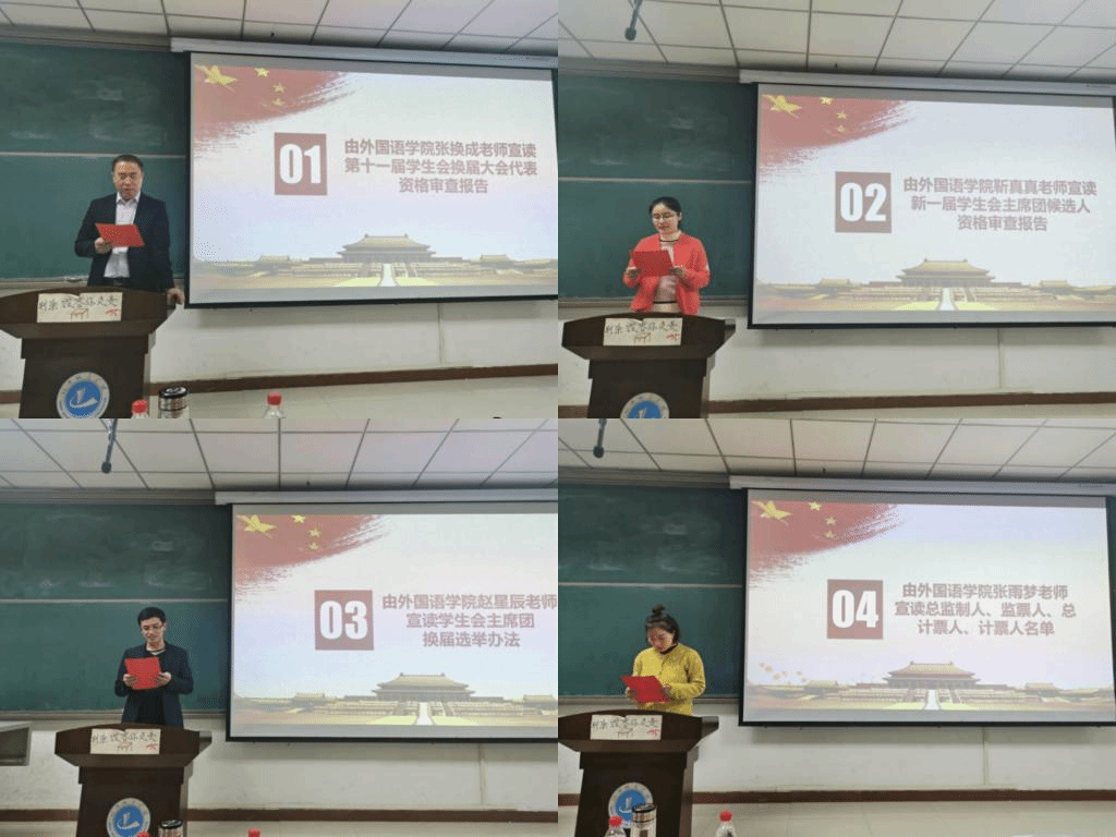大会在主持人的致辞中拉开序幕。首先是张换成老师宣读“第十一届学生会换届大会代表资格审查报告”,然后是程燕霞老师宣读“新一届学生会主席团候选人资格审查报告”,接着是赵星辰老师宣读“学生会主席力团换届选举方法”,最后是张雨梦老师宣读“总监制人、监票人、总计票人、计票人名单”。宣读完毕之后,各候选人开始竞选演讲,21名新一届主席团候选人依次上台发表演说。竞选演讲结束后,各代表秉承民主、公平、公正的原则进行投票选举。最后,大会在主持人的致辞中拉下了闭幕,本次换届大会圆满落幕。