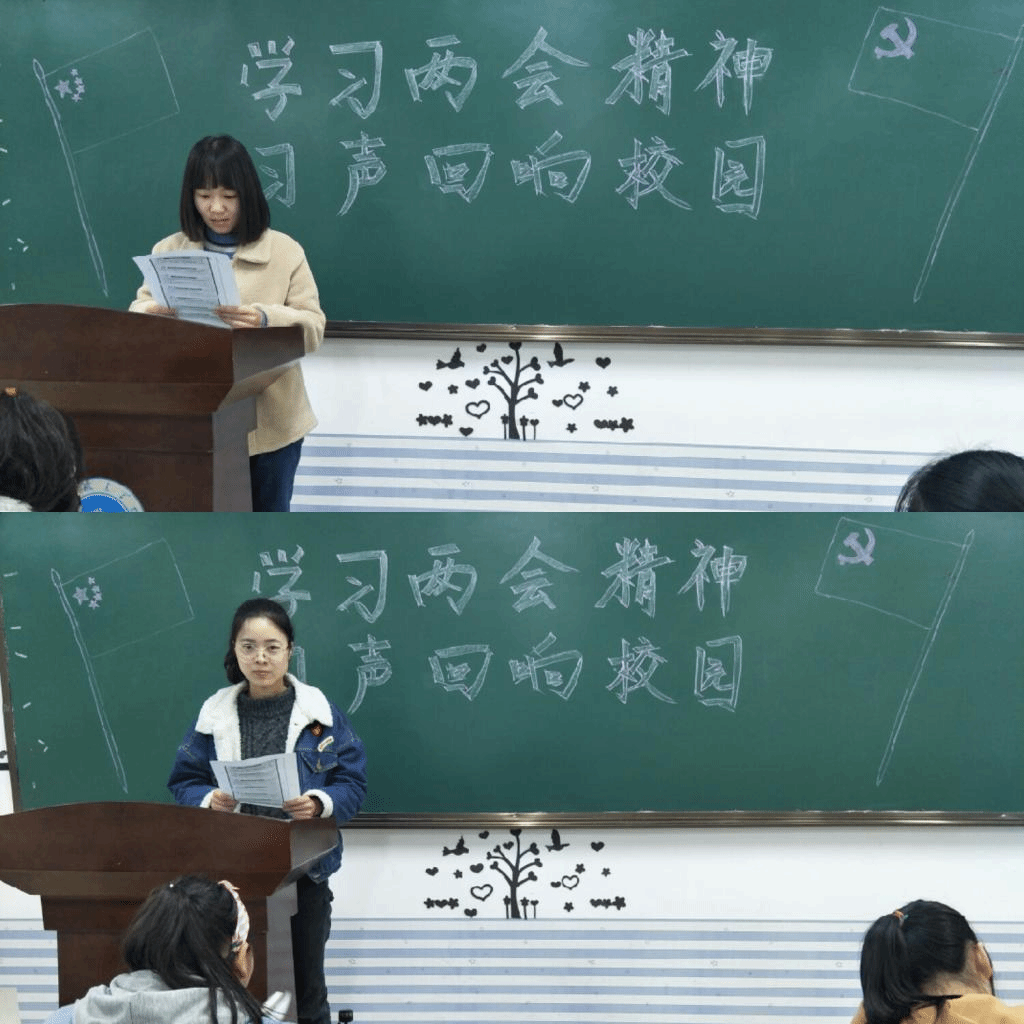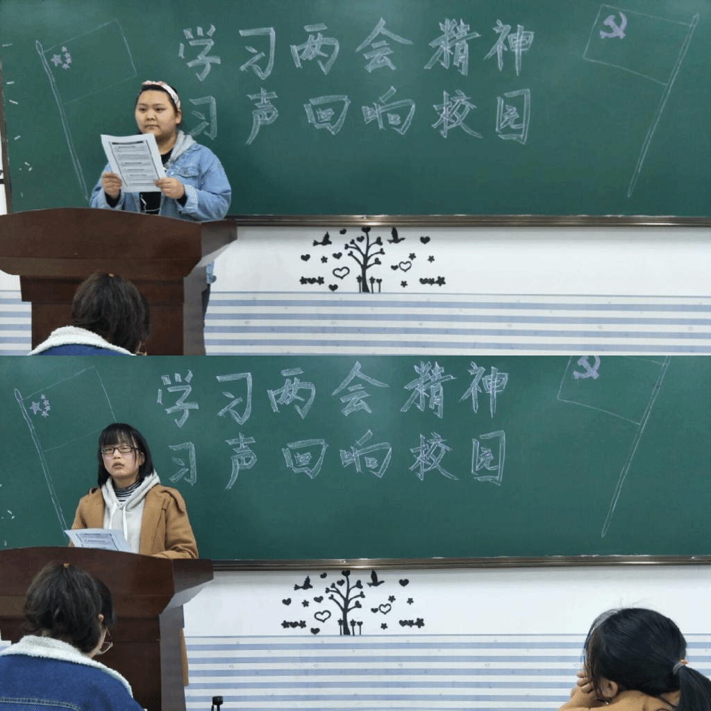 尹嘉宁同学讲:“我们务必始终秉持习近平总书记所反复强调的‘艰苦奋斗、勤俭节约’的思想,发扬优良传统,培养优良道德品质。”邵云同学讲:“从习近平总书记“两会”讲话金句中,可以看出脱贫攻坚在新时代全面建成小康社会的重要地位,作为英语专业的同学,需要学好商务英语,将边陲和农村地区物美价廉的农产品推介到‘一带一路’沿线国家。”王佳鑫同学讲:“习近平总书记讲‘把当代中国的发展进步和当代中国人精彩生活展示好,把中国精神、中国价值、中国力量阐释好’,我们翻译专业的同学需要掌握人工智能翻译技巧和翻译常识,将更多优秀的文化作品译介到世界文坛上去。”陈卓同学讲:“李克强总理所作的政府工作报告,掷地有声,干货满满,特别是‘稳定和扩大就业、鼓励更多社会主体创新创业、发展更加公平更有质量的教育’的目标振奋人心。”
