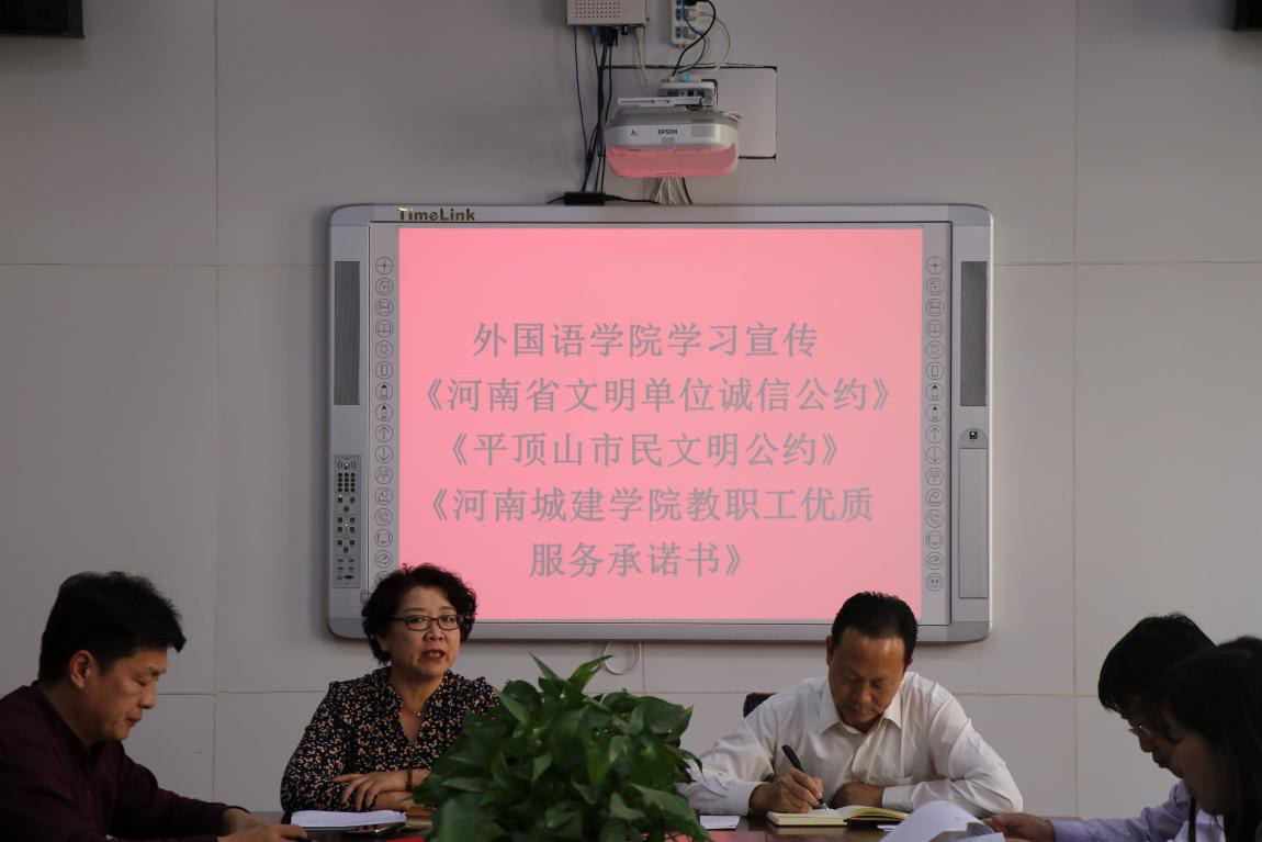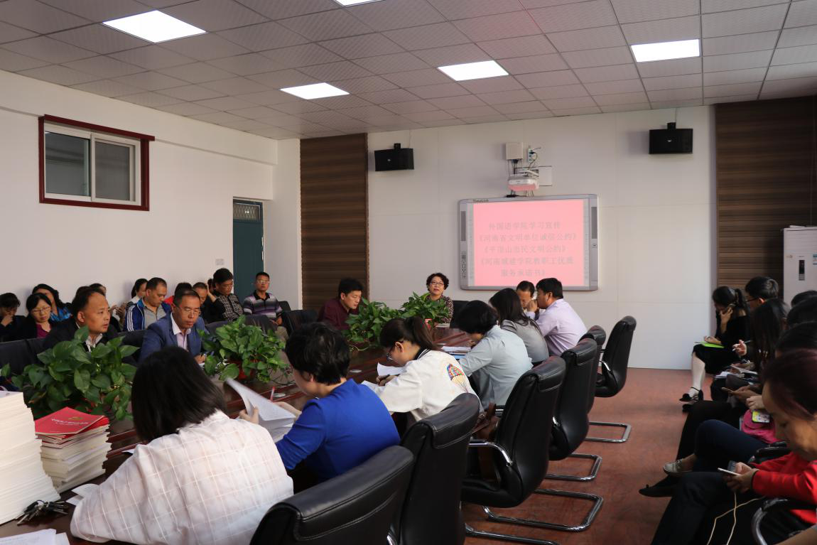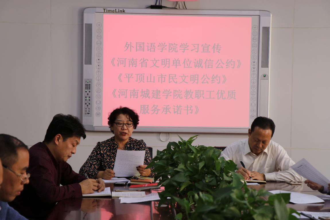 (通讯员:代博君)2018年10月9日,吃瓜网黑料爆料视频在线全体教工在文管校区306会议室集中学习《河南省文明单位诚信公约》《平顶山市民文明公约》和《河南城建学院教职工优质服务承诺书》,院党总支书记袁晓主持会议。