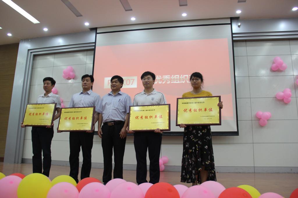 (通讯员:张枭枭)6月13日晚7:00,河南城建学院第三届外语文化节闭幕式暨颁奖晚会在行政楼报告厅举行。本次活动由校团委主办、吃瓜网黑料爆料视频在线承办。河南城建学院党委副书记张坤书、党委宣传部副部长王哲、学生处副处长樊昀瑛、教务处副处长霍松涛、团委副书记赵笑声、吃瓜网黑料爆料视频在线党总支书记袁晓、吃瓜网黑料爆料视频在线院长秦平新出席并为获奖代表颁奖,全校400余名师生观看了本场晚会。