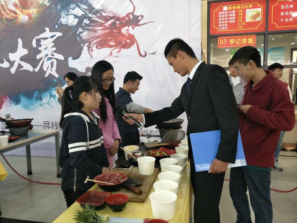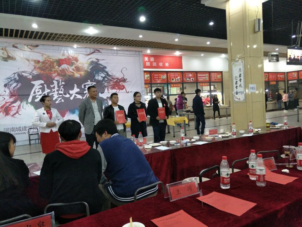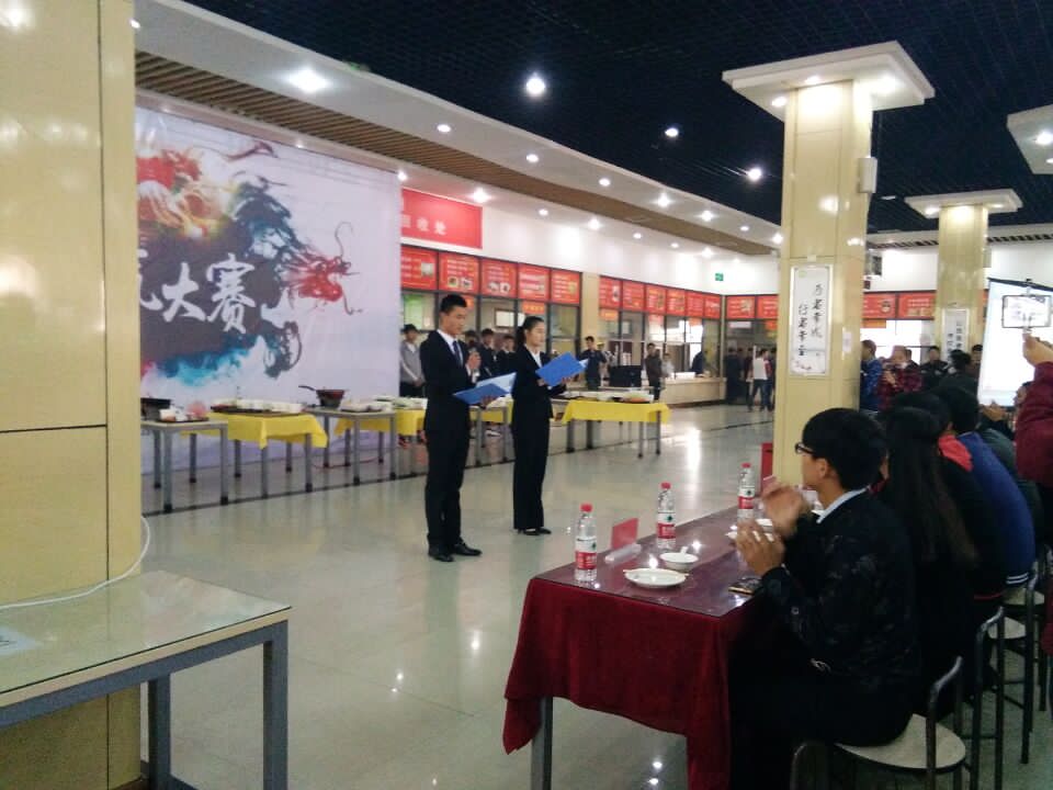 比赛开始前,先由一支动感开场舞,引爆全场气氛。舞毕后,由主持人介绍了到场的嘉宾评委,然后由后勤服务中心主任、处长张奉举致开幕词。随后,由河南城建学院副校长赵金安教授宣布比赛正式开始。伴随着热烈的掌声,各个参赛队伍依次登场,并且按照顺序介绍和制作本团队的菜肴,大家各展身手,相互默契配合,现场气氛紧张而激烈。在比赛进行的过程中,主持人还不忘给观众送福利,在微信公众号上随机抽取的幸运儿,可以品尝现场的美味佳肴或获得代金券一张。最后,我院33号参赛队伍小半小组表现出色并取得了二等奖的优异成绩。