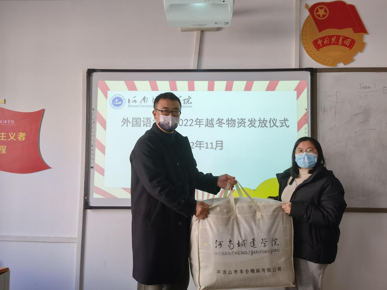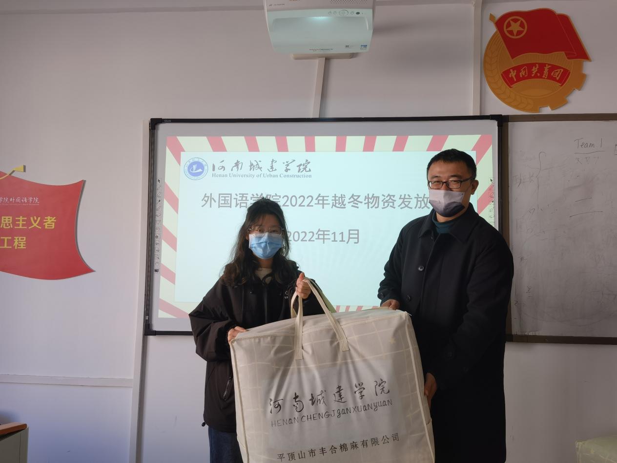 发放仪式上,胡思博细致地询问了同学们的学习和生活情况,就居住环境、室友关系、学业进展、生涯规划等和同学们进行了亲切交流,勉励大家一定要珍惜在学校读书时的美好时光,踏实努力,勤奋向学,不负韶华。随后,胡思博向受资助学生发放越冬物资,并希望同学们能心怀感恩,刻苦学习,树立理想,砥砺品格,增长本领,努力成为能担大任的时代新人。受助学生代表表达了对学校和学院的感谢,并表示将不负学院领导和老师的期望,努力学习,艰苦奋斗,努力为国家和社会贡献自己的力量。