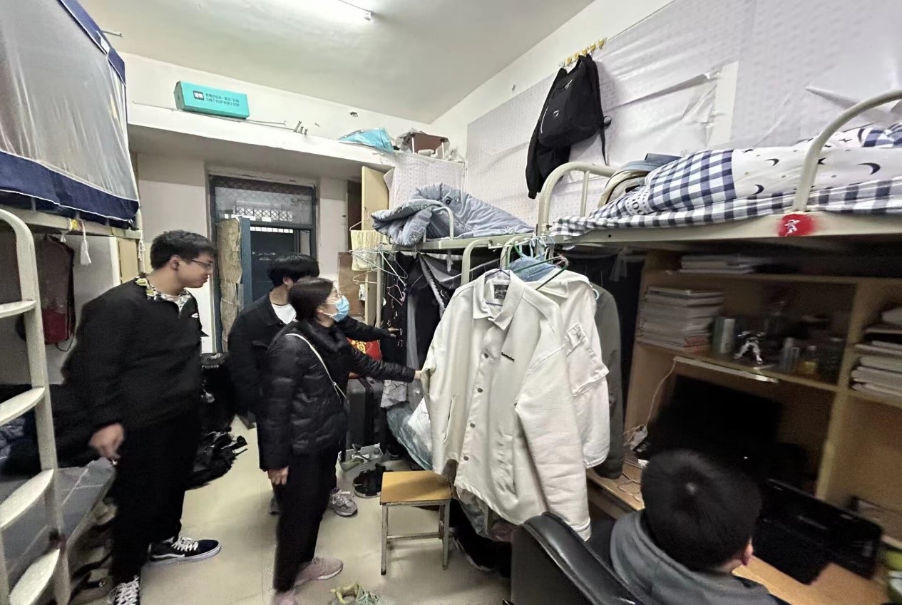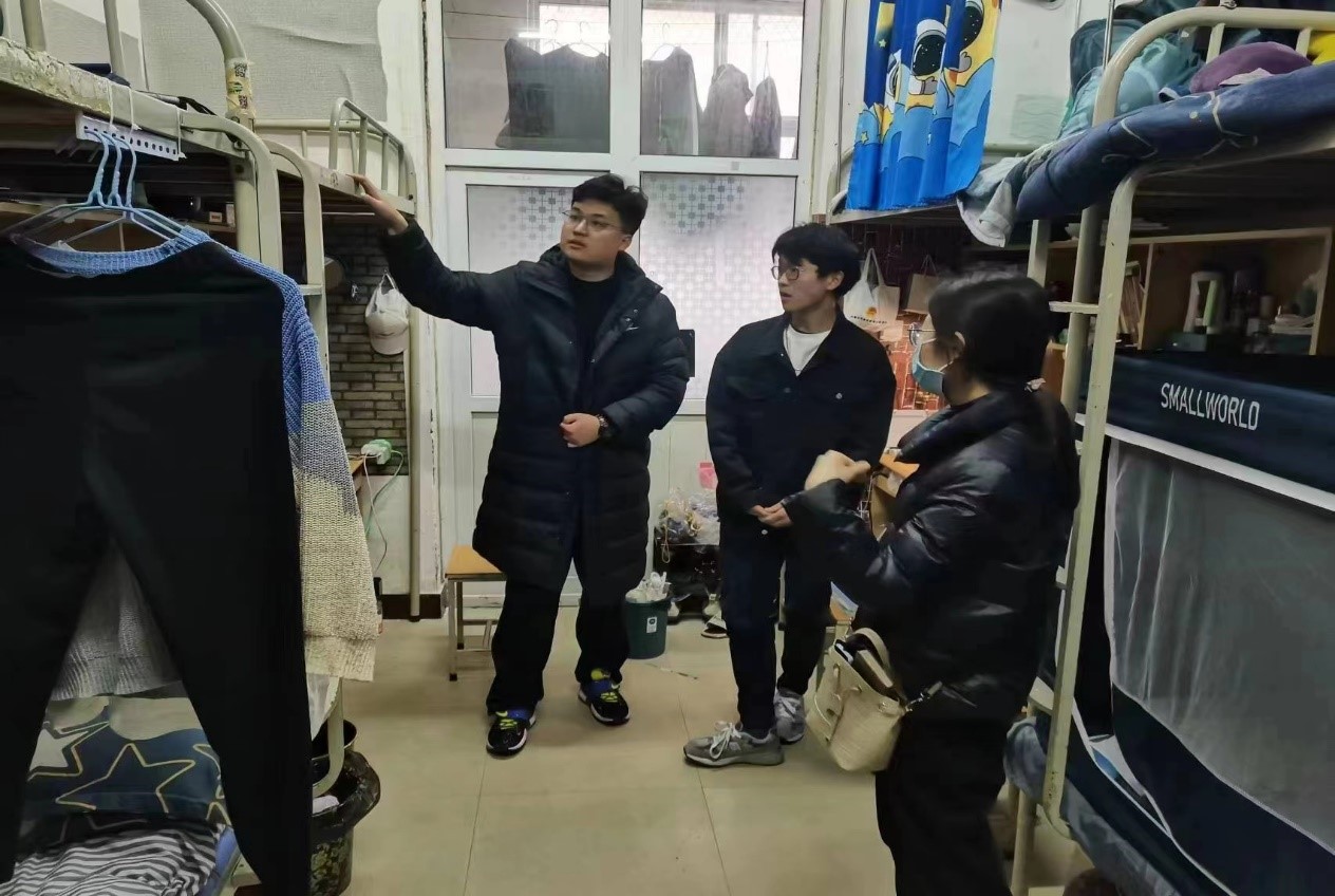 在此次的检查工作中,靳真真老师深入学生宿舍,围绕宿舍生活中的各类事项与同学们进行交流,了解同学们在宿舍中生活学习的情况。在检查过程中,靳真真仔细询问了宿舍电器设施的使用情况,提醒同学们在使用室内电器的过程中要注意用电安全,不要携带违禁物品。同时,靳真真对宿舍的床铺安全进行了检查,提醒同学们要注重宿舍卫生,做好宿舍的内务整理工作。最后,靳真真结合自己学生时代的生活经历,建议同学们合理安排日常作息时间,日常坚持进行锻炼,提高身体素质,鼓励同学们保持良好的宿舍生活习惯,营造良好的生活学习氛围。