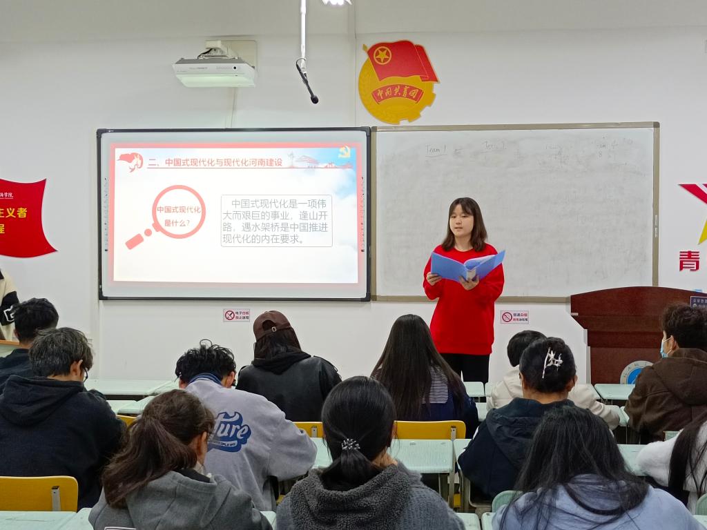 活动中,宣讲人杨宜林首先通过党的二十大报告关键词和政府工作报告展示了近年来我们所取得的成就与发展,让党的二十大精神更深入人心。随后,宣讲人马小龙通过展播视频,让各位同学更直观地感受到近年来党和国家所取得成就与发展。最后,两位宣讲人表示明天的中国,希望寄予青年。作为青年一代,我们要为现代化河南建设注入属于自己的力量,为实现中华民族伟大复兴增砖添瓦。
