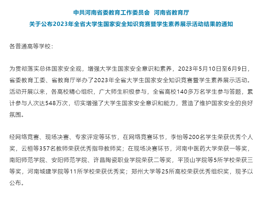 近日,河南省教育厅公布了2023年全省大学生国家安全知识竞赛暨学生素养展示活动结果,我院教师于瑞雪荣获“优秀指导教师”、学生金颖琦、钱梦男、高婷婷、李凝暄、史子晗、陈晓怡、刘清扬、吴韬荣获“优秀个人奖”。