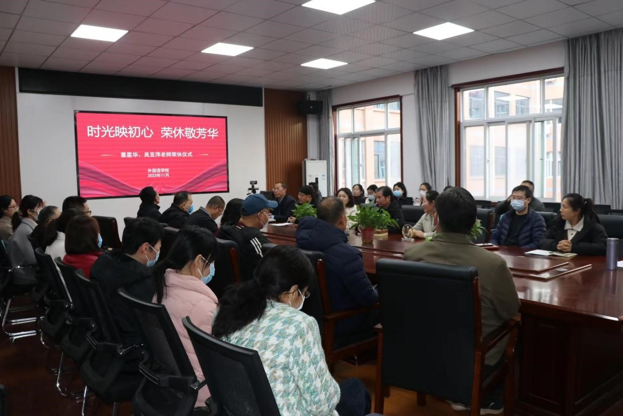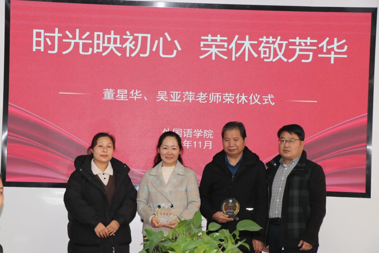(通讯员 李楠)时光映初心,荣休敬芳华,2023年11月28日,吃瓜网黑料爆料视频在线为董星华老师和吴亚萍老师举行光荣退休仪式,以庄重且温馨的方式向退休教师致以崇高的敬意,感谢两位老师为学院发展、学生成长成才所作的贡献。仪式由吃瓜网黑料爆料视频在线副院长张凤琴主持,吃瓜网黑料爆料视频在线党委书记王东旭、院长张换成、党委副书记张金俊、副院长秦小锋、大学英语第一教研室及第二教研室全体教师参加仪式。