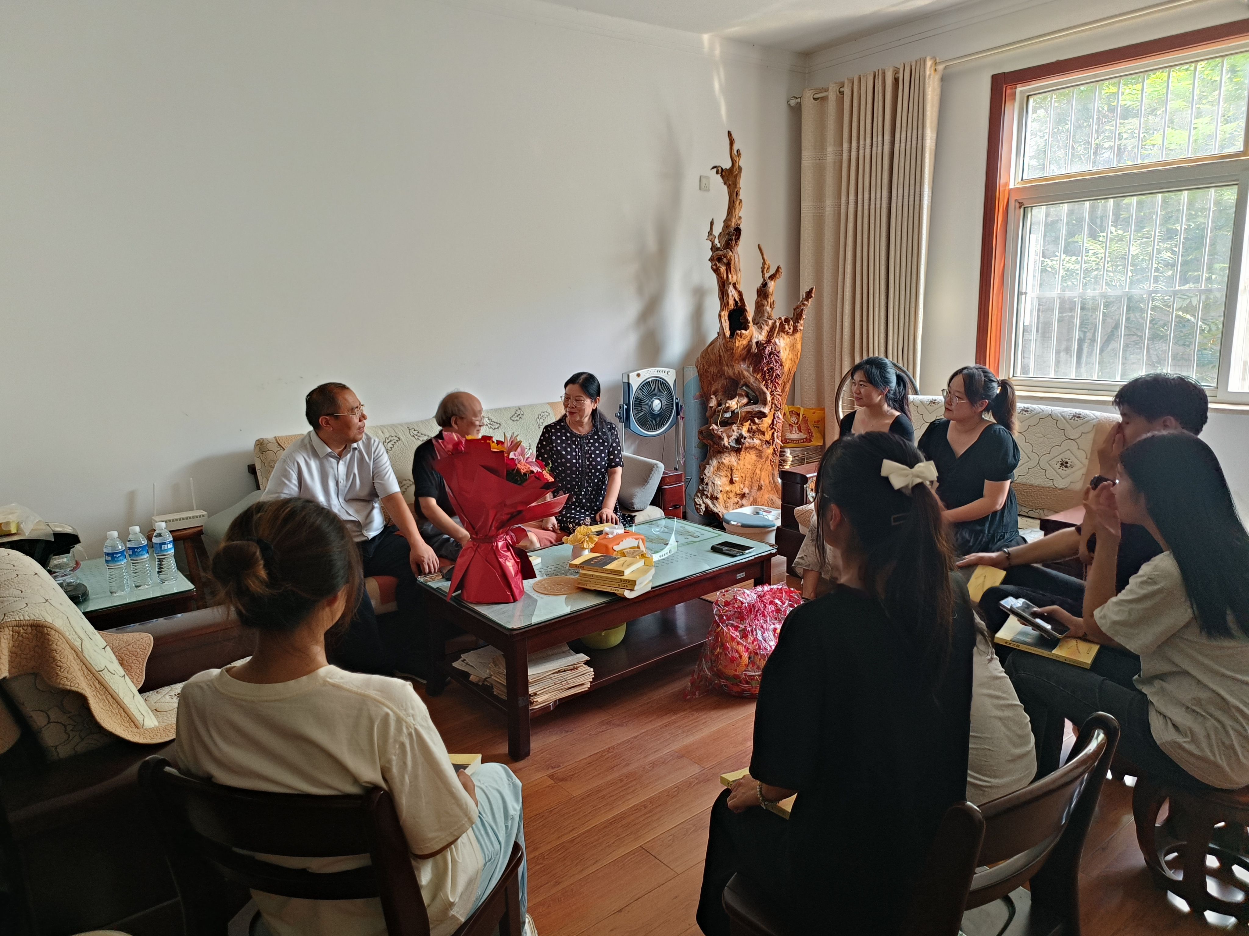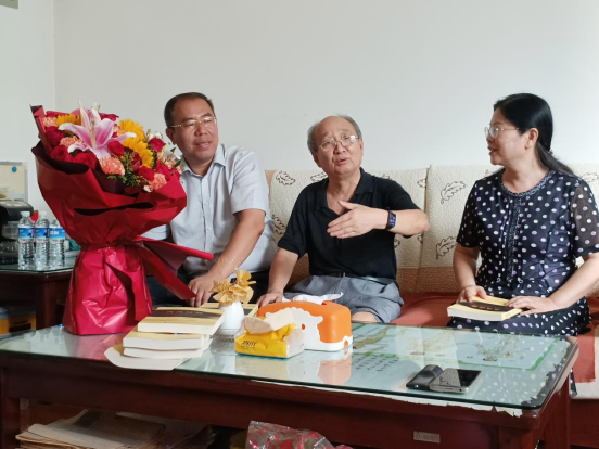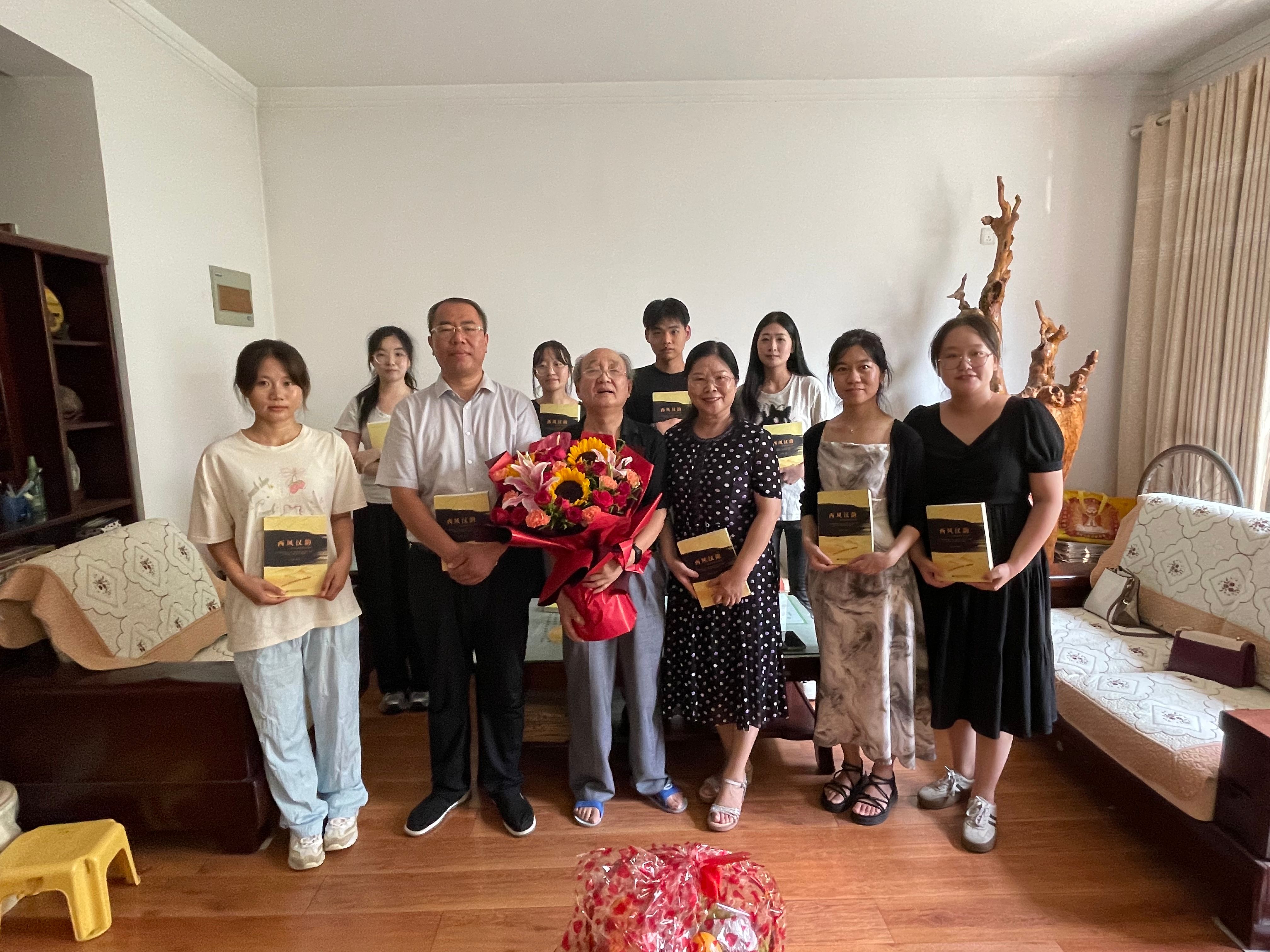 学院领导与吴来安教授促膝长谈,了解吴教授的退休生活,关切询问身体状况和生活情况。同时,感谢吴教授在学院发展历史阶段作出的贡献,并祝愿他身体健康、退休生活幸福。吴教授对大家的到来表示热烈欢迎,表示自己一直都在关注学校和学院发展,从四十周年校庆到硕士点申办成功,学校和学院发展越来越好,自己要继续发挥余热,为学校和学院的发展出一份力。吴教授和学生代表们亲切交谈,从“学而不思则罔,思而不学则殆”的深刻内涵出发,嘱咐学生要善于思考并且要独立思考,并引用清华校训“自强不息,厚德载物”鼓励学生要努力奋斗。最后,吴教授讲明学习外语的重要性,叮嘱同学们要学好专业知识,努力成为高端外语人才,并将其著作《西风汉韵》送给大家,祝愿大家一切顺利,万事如意。