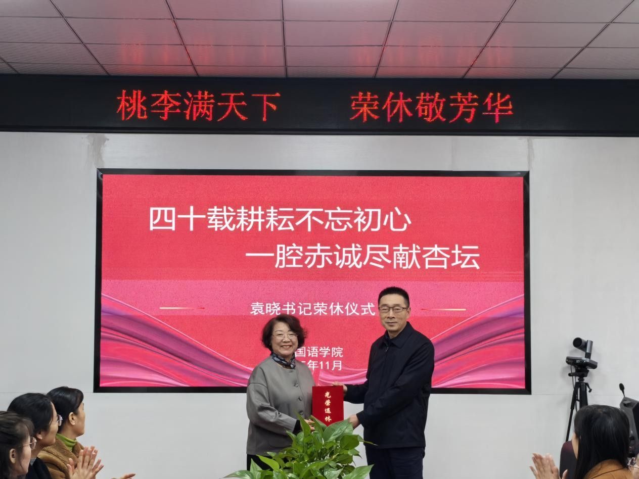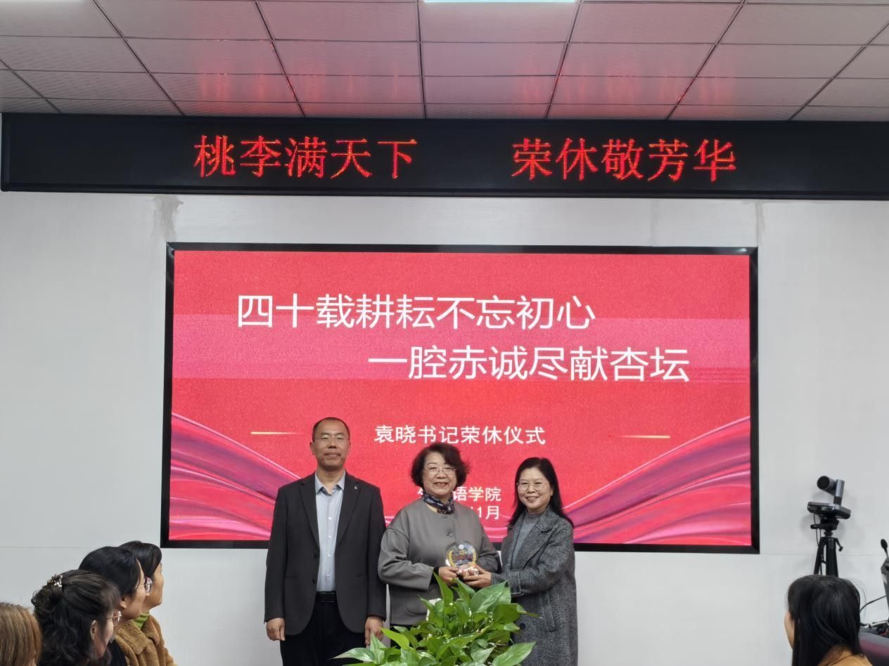 仪式伊始,王许涛宣读了学校关于袁晓同志退休的决定。随后,会议简要回顾了她的教育生涯。袁晓同志从教四十载,职业生涯深深扎根于吃瓜网黑料爆料视频在线,曾担任团学办主任、外语系实验中心主任、外语系副主任、吃瓜网黑料爆料视频在线党总支副书记、党总支书记等职务。无论在哪个岗位,她始终秉持高标准、严要求,是学院教学科研稳步提升的推动者,也是党建工作扎实开展的领路人。