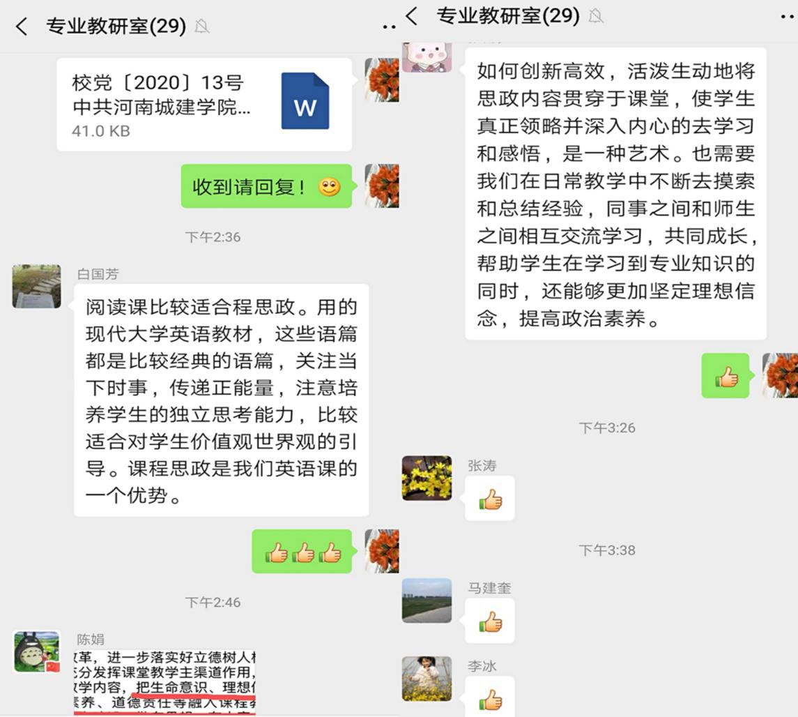 会上,各教研室主任首先带领教师学习了总书记回信的具体内容,随后强调教师在授课过程中对学生进行专业知识教育的同时,要加强理想信念教育,将课程思政融入到日常教学当中去。接着,广大老师就如何在课程中结合思政内容,做到立德树人,进行了广泛的讨论和发言。