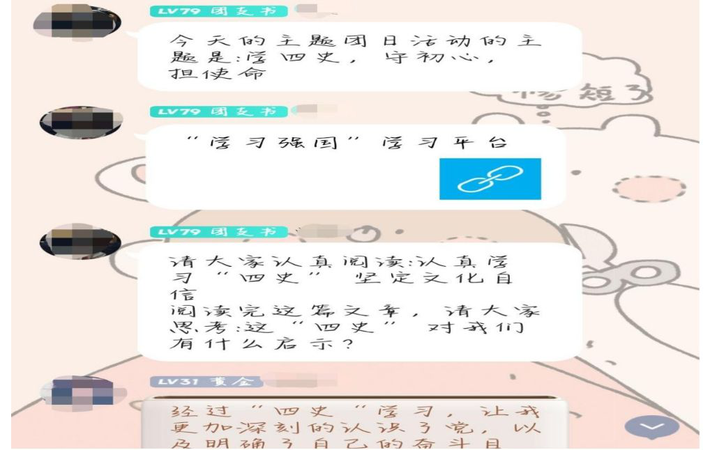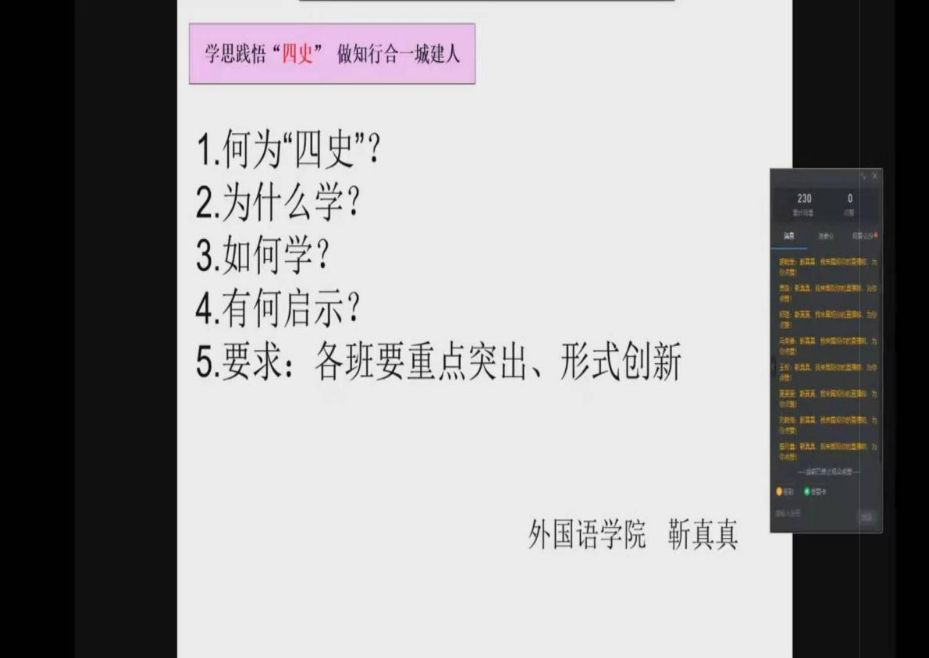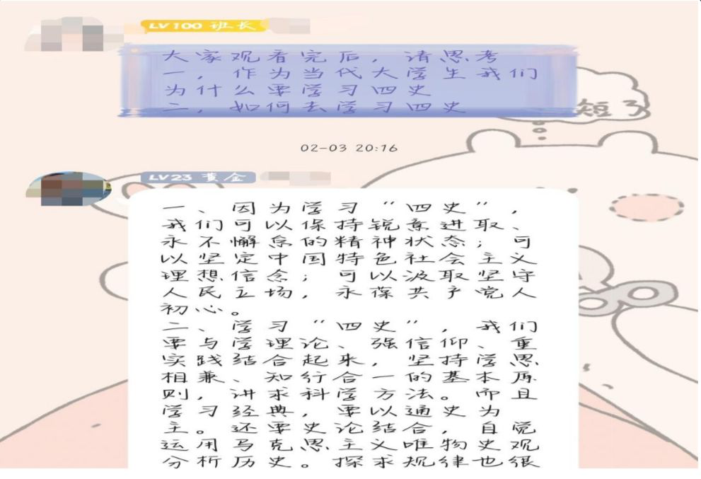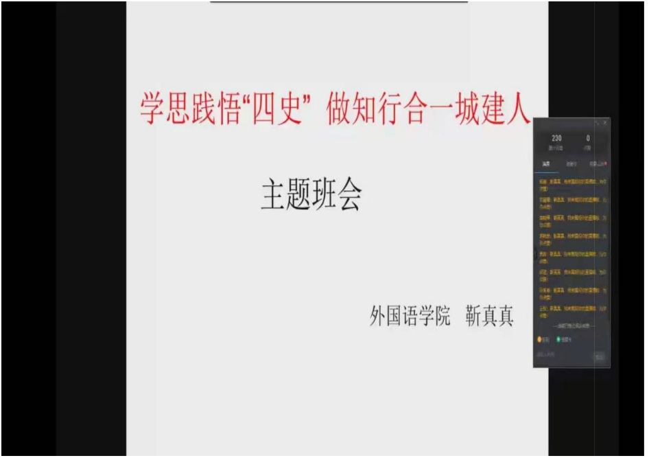 “四史”线上团日活动。在主题团日活动中,各班团支书通过分享有关“四史”的视频和文章,使同学们进一步了解“四史”知识。同学们针对如何学习“四史”知识、通过哪些途径学习“四史”知识等问题展开了热烈讨论,在同学们的积极参与中,主题团日活动顺利开展。