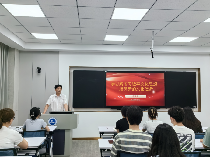 宿金勇围绕“新时代党领导文化建设实践经验的理论总结”“对中国特色社会主义文化建设一般规律的系统阐释”和“新时代新征程为新的文化使命挺膺担当”三个方面进行了深入的阐述。课上,宿金勇从习近平总书记在一系列重大活动、重要讲话、重要指示中和围绕新时代文化建设提出的一系列新思想新观点新论断中系统阐述了习近平文化思想的形成脉络;从“四个深刻领会”引导大家把握习近平文化思想蕴含其中的重大创新观点、科学方法论和重要战略部署,深刻领会其核心要义。他指出,新时代的青年学生是中华民族伟大复兴中国梦的希望所在,是中华文化传承者、创新者,也是现代文明建设的先锋队、主力军,在实现新时代的文化使命中肩负重任、责无旁贷。就如何担负起新时代的文化使命和担当,提出了三点希望:一是在弘扬传承中坚定文化自信,礼敬优秀传统文化,坚定不移地走中国特色社会主义文化发展之路;二是在守正创新中厚植文化情怀,做到古为今用、洋为中用、辩证取舍、推陈出新,提炼和展示中华文明中具有当代价值、世界意义的精神标识和文化精髓;三是在交流互鉴中讲好文化故事,利用新媒体、新话语、新形式向世界讲好中国故事,传达中国理念,宣介中国经验,贡献中国智慧。