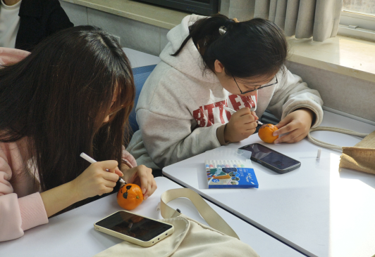 活动伊始,教室里洋溢着轻松愉悦的氛围,现场准备了充足的橘子和多彩的涂鸦工具,每位同学领到橘子后,都尽情挥洒创意,在橘子上进行涂鸦创作,有的同学画上了趣味表情,寓意着积极向上的精神,有的同学则画上了自己喜爱的卡通形象,展示着个人的独特兴趣,还有的同学选择画上一些抽象的图案,传递着他们的奇思妙想,一笔一画间都能让情感与灵感在指尖流淌。随后大家围坐在一起,互相欣赏和讨论着各自的橘子作品,不少同学都分享了自己的创作灵感和涂鸦背后的故事,将这份个人的小确幸传递给每一位倾听者,彼此交换感悟,让心灵的触动持续升温。