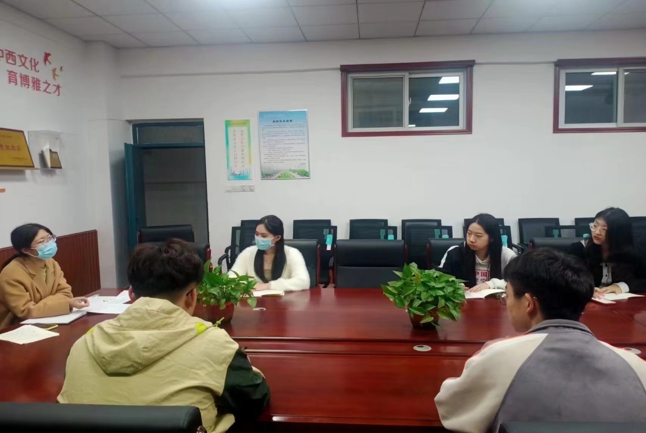 会议内容主要分为两部分。一方面,靳真真提到对于“喜迎二十大,永远跟党走,奋进新时代”教育实践活动,要把实践活动和学习活动相结合,推动其更好地开展,以期取得更好的效果。另一方面,靳真真指出,要做好我院学生会与英语协会联合举办的英语演讲比赛在各媒体平台的宣传工作,这项比赛有利于提高学生的学习兴趣,同时也能够为学院营造良好的外语学习氛围。