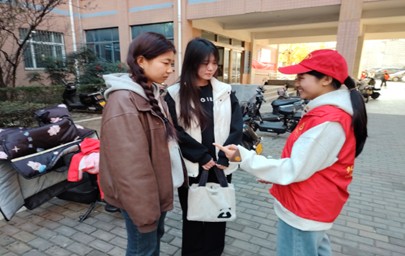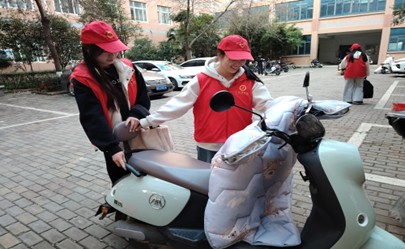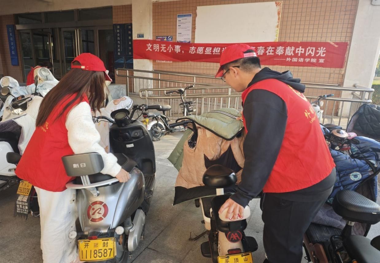 活动现场,志愿者们热情满满:有的佩戴红色志愿马甲与帽子,向过往同学讲解电动车规范停放、骑行安全等知识,耐心提醒出行注意事项;有的细心整理乱停的电动车,将车辆有序摆放至指定区域,确保通道畅通;还有的协助同学规范安装电动车保暖装置,避免装置松散影响骑行安全。大家分工明确、配合默契,活动氛围温馨而高效。